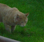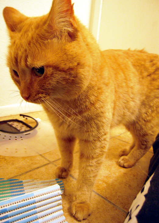 On Monday, I picked up Red from the boarding place and brought him to Beatrice's house, where Scoots (now 'Scuse) had been recuperating since his neutering. There was some hissing on 'Scuse's part, presumably because Red smelled like vet and because Red, who he hadn't seen in 2 weeks, was invading his space. (What if he eats all mah gooshy fud??) But there was nothing worse than that.