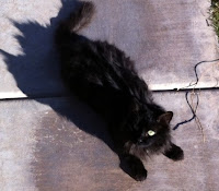 The next morning, I spent a lot of time hanging out with them. I had some fantastic cuddle time with Red as he just purrrrrrred and sprawled across my stomach. 'Scuse isn't entirely pleased when someone other than himself gets attention, but for a good long while, he lay beside me as Red was in my lap, and we just hung out. It was lovely. Less lovely was discovering that in his struggles on the plane the night before, Red had torn out one of his claws. Poor baby!! As long as it doesn't get infected, it should be okay. It was obviously bothering him a little-- he kept licking it-- but it wasn't making him limp or anything, so that's a good sign.